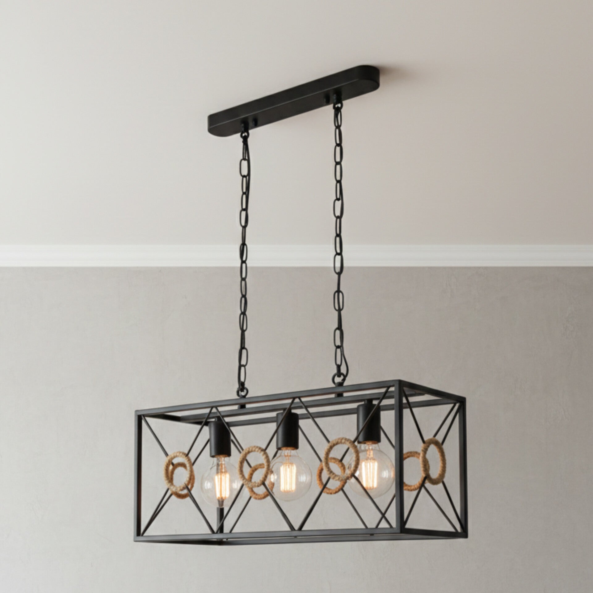 This light fixture features a black metal rectangular cage frame that houses three exposed bulbs for maximum light distribution. The frame is accented with decorative natural rope rings that add a rustic texture to the industrial design. It hangs from a matching black ceiling mount by two sturdy metal chains that can be adjusted to your preferred height. This piece serves as a bold focal point while providing ample illumination for large areas. The open design ensures that light reaches every corner of the room without being obstructed by a shade.