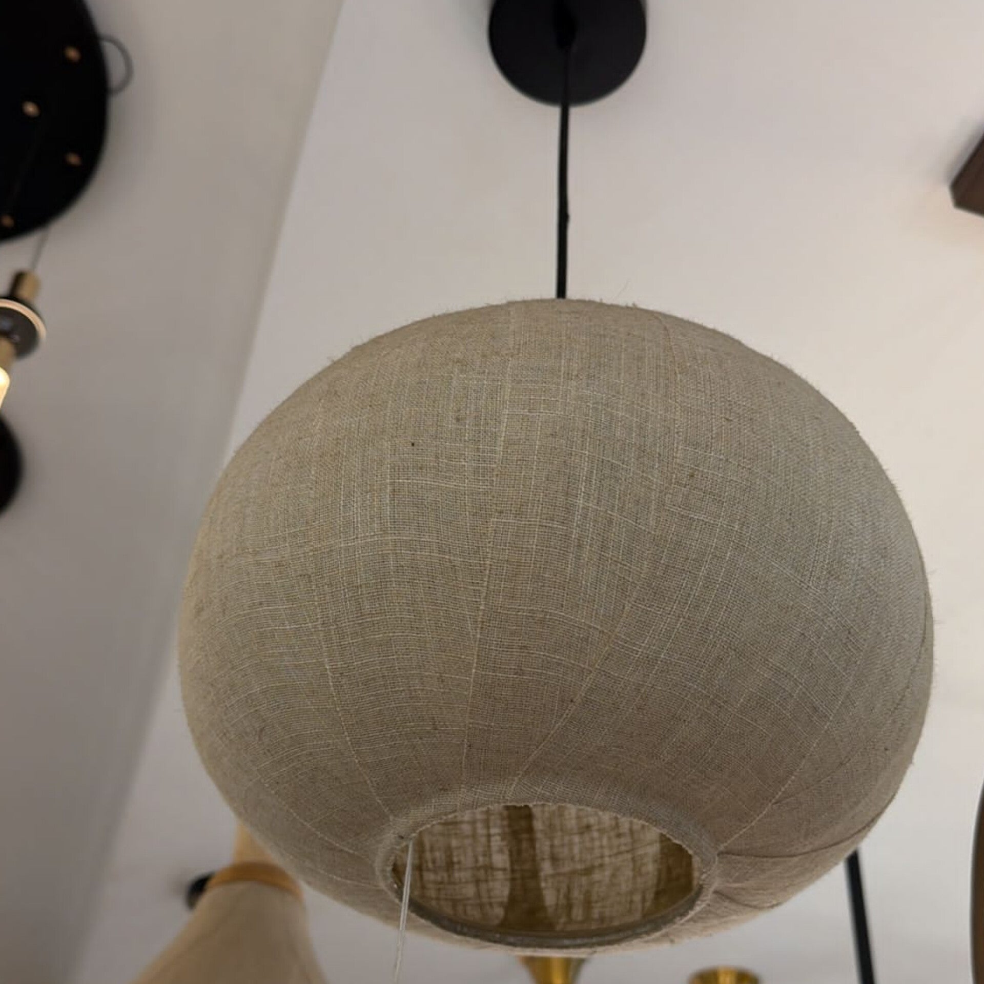 This ceiling fixture features a large spherical shade crafted from textured linen fabric to provide warm and even light distribution throughout a room. The natural material of the shade diffuses the internal light source to create a soft environment while reducing harsh glare. A black circular mounting plate and a matching adjustable cable allow the unit to be installed at various heights depending on the space. The package includes a 9W LED bulb to ensure the light is ready for immediate use upon installation. Its simple geometric form makes it a reliable choice for providing overhead illumination in a variety of residential settings.
