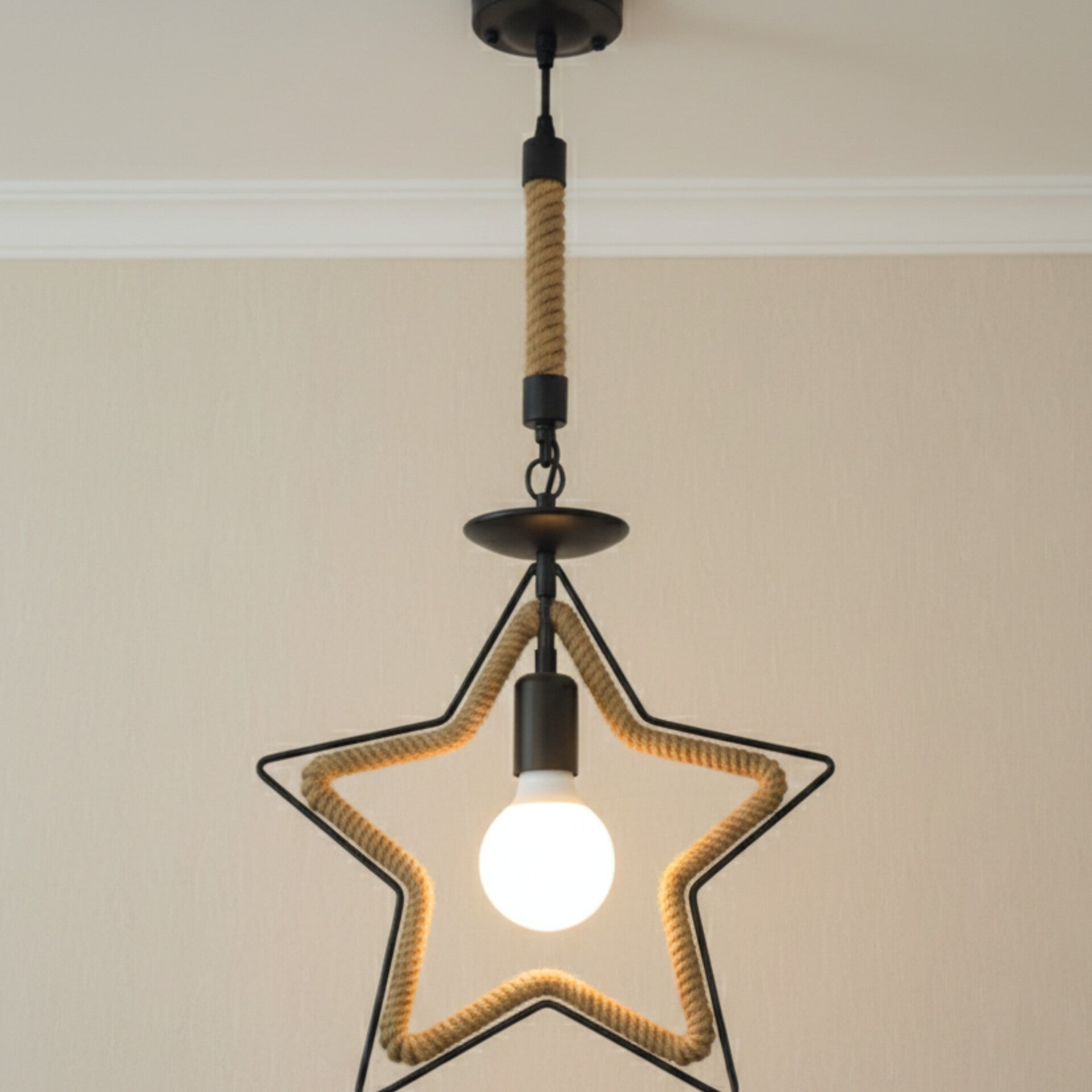 This light fixture features a unique star shaped frame constructed from black metal that encloses a secondary star outline wrapped in natural jute rope. The combination of industrial metal and rustic fibers provides a balanced visual texture that serves as a centerpiece in any room. A single exposed bulb hangs at the center of the geometric design to provide clear and direct illumination. The light is suspended by a rope wrapped cord that connects to a circular black ceiling mount for a consistent appearance. This piece adds a playful yet grounded character to interior living spaces.