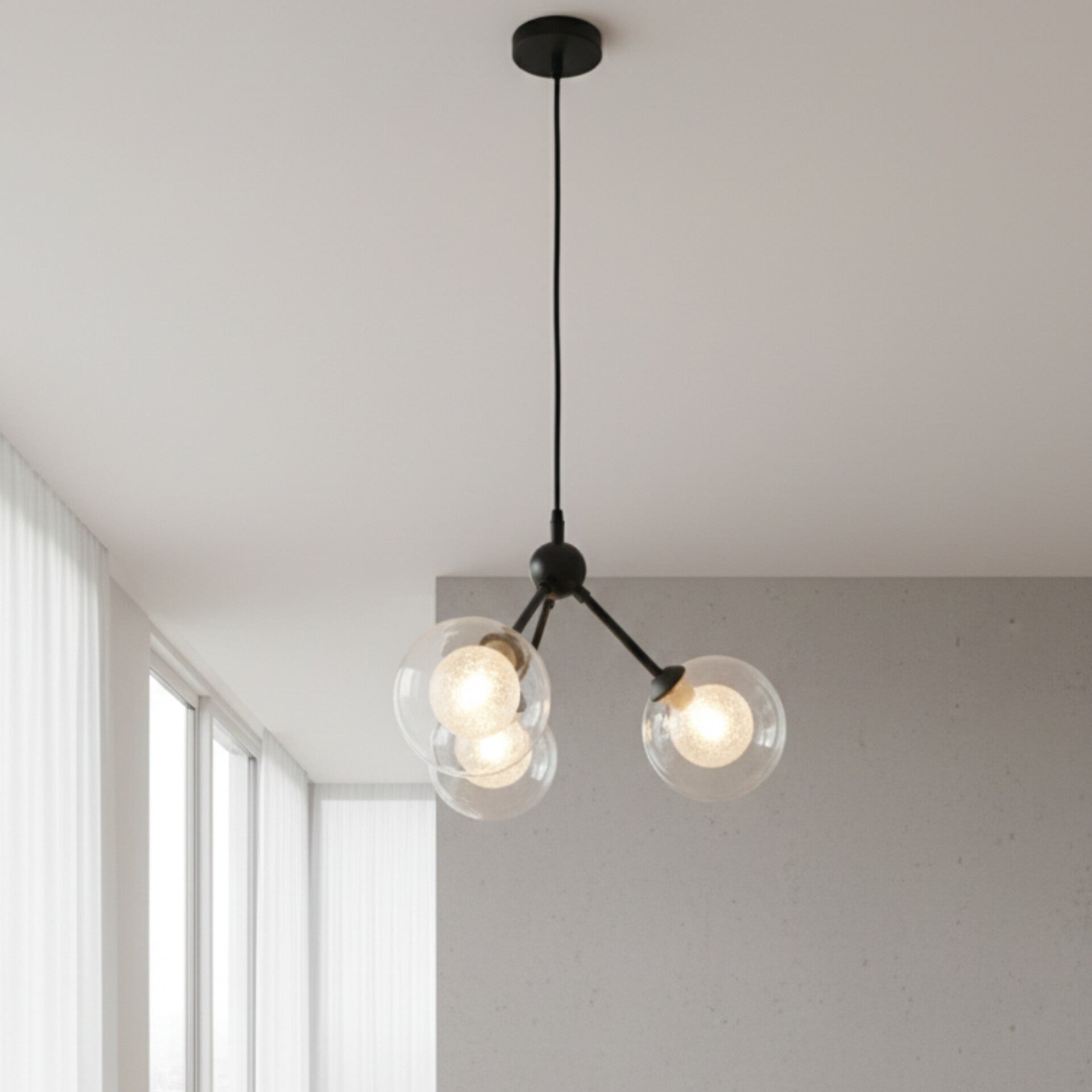 This ceiling fixture features three spherical glass globes attached to a central branching frame to provide balanced illumination across a room. Each globe contains a textured internal element that diffuses light effectively while reducing direct glare for a comfortable environment. The adjustable cord allows for customized hanging heights to suit various ceiling levels and furniture arrangements. Its minimalist construction ensures the light remains a functional focal point without overwhelming the surrounding decor. This fixture serves as a reliable primary light source for dining areas or entryways while adding a distinctive visual element to the ceiling.