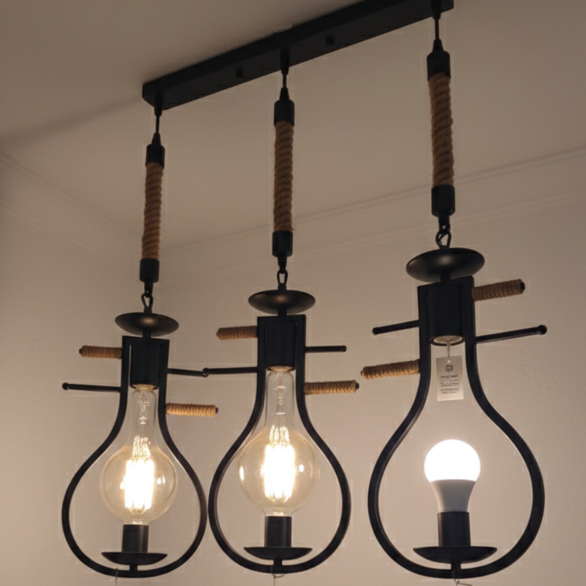 This ceiling fixture features a linear black bar supporting three individual light sources wrapped in durable natural jute rope. The open frame design allows light to spread freely in all directions while providing a distinct rustic look for any room. Each pendant is suspended by a thick rope cable that adds texture and a unique character to the lighting arrangement. The sturdy metal construction ensures a secure installation on most ceiling types. This functional light source serves as a reliable way to illuminate large areas like dining tables or kitchen islands.