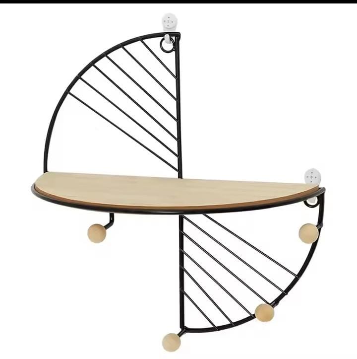 Elevate your home or office decor with this eye-catching, modern wall-mounted shelf featuring a unique semicircular design. Combining durable metallic framing with a solid wooden shelf, it offers both stylish decoration and practical storage. The integrated hooks provide a perfect spot for hanging keys, bags, or light accessories, making it an ideal organizer for entryways, bedrooms, or living spaces. Available in two versatile finishes: sleek Black and elegant Gold.